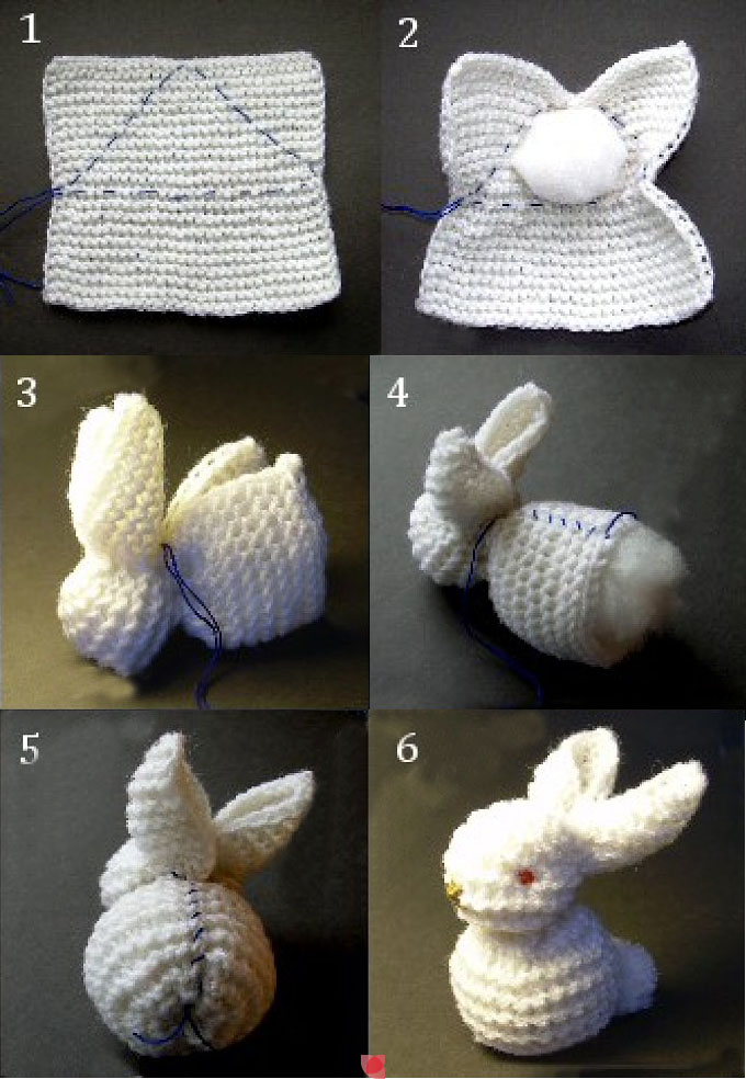 First crochet (or knit) a washrag using your favorite pattern. Then using a coordinating thread (the blue in photo is just for instructional purposes) to sew up as pictured; adding fluffs of poly-fill or cotton balls. Make sure to add a pompom of white for the tail and eyes and nose with colored embroidery floss or beads.