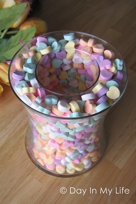 Take two different size vases and between them fill with anything and voila: the perfect centerpiece! (You can by cheap vases from the dollar store.)