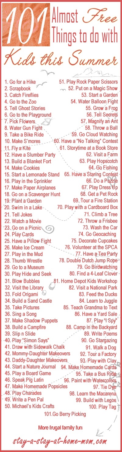 101 Almost Free Things Kids Can Do This Summer via Share this: Click to share on Facebook (Opens in new window) Facebook Click to share on X (Opens in new window) X Click to print (Opens in new window) Print Click to share on Tumblr (Opens in new window) Tumblr Click to email a link to a friend (Opens in new window) Email Like Loading... Related $ave itAround the houseArtCommunicate itCraftsDid You Know?EducationFamilyFunGamesGrow itInspirationalKidsLeisureOrganize itOutdoorsParty IdeasRecycle itReferenceScout MeetingWorkshop