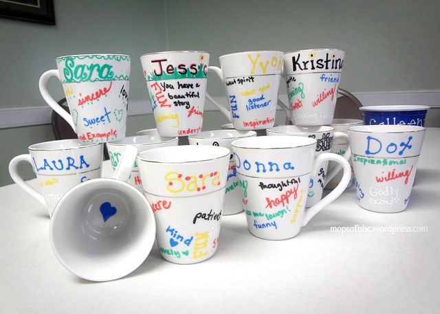Everyone in the group writes their name on a mug using glass paint markers. Then pass – each person writes a positive message, word or phrase that describes that person on his/her mug. allow it to dry for 4 hours. Bake at 375* for 40 minutes to set it. Enjoy!