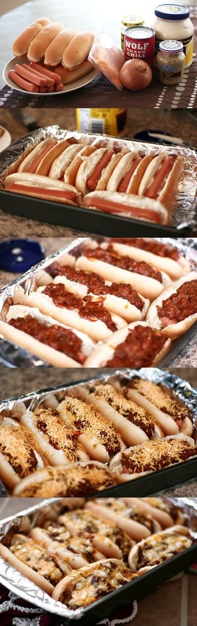 Top hot dogs with chili, cheese, and diced onion. Cover with aluminum foil and bake at 350F for 45 minutes.