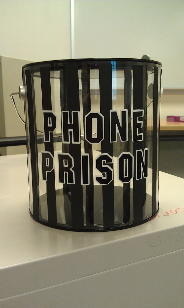 Use black electrical tape and sticky letters on a clear container (in this case a faux paint pail) to make a phone prison. Makes an entertaining way to have a peaceful dinner, classroom, or can be used as punishment as needed. Genius!