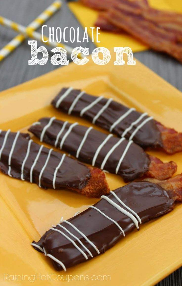 Chocolate Covered Bacon 1 lb Thick Cut Bacon 1/2 cup Semi Sweet Chocolate 1 tsp Shortening 1/8 cup White Chocolate Click HERE for the instructions Share this: Click to share on Facebook (Opens in new window) Facebook Click to share on X (Opens in new window) X Click to print (Opens in new window) Print Click to share on Tumblr (Opens in new window) Tumblr Click to email a link to a friend (Opens in new window) Email Like Loading... Related Dessert - Yum!FunKitchenParty FoodsSnack it!