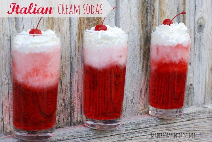 Italian Cream Soda Raspberry and Vanilla Syrups Club soda Half and half cream Whipping cream Maraschino cherries Ice Click HERE for the instructions Share this: Click to share on Facebook (Opens in new window) Facebook Click to share on X (Opens in new window) X Click to print (Opens in new window) Print Click to share on Tumblr (Opens in new window) Tumblr Click to email a link to a friend (Opens in new window) Email Like Loading... Related Dessert - Yum!Drink ItKitchenParty FoodsParty IdeasSnack it!