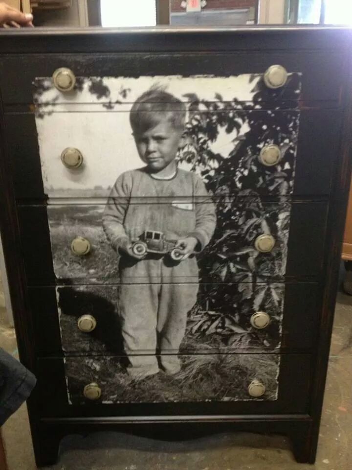 This Mom decoupaged a dresser with a picture of her dad as a youngster for her own son’s room. Genius!