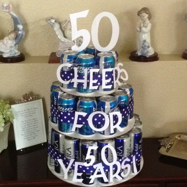 Great centerpiece for a 50 birthday party. Using cardboard rounds and cans, set up the tower. Wrap ribbon around each layer, add your cut out paper letters, voila!