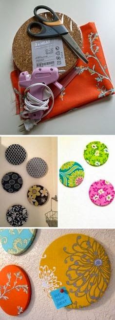 Use hot glue to secure fabric to cork rounds. Add a hanger on back. hang up and enjoy your new purposeful wall decor. Also think about recycling a circle from a favorite t-shirt over a cork board too. Genius!d87ea049b0d2a1c74a1003266a6139cfpic via