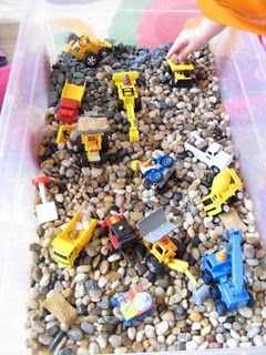 Pick up some dollar store rocks, toy construction vehicles and tools, and a big bin. The kids will spend hours with this. Check it out HERE
