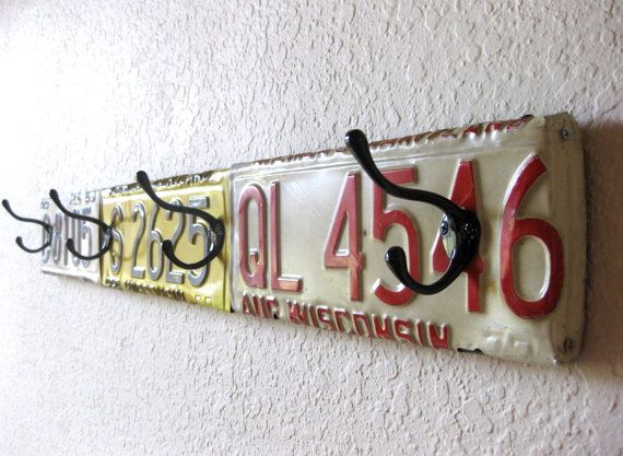 Hammer to shape and screw some old license plates onto a 2×4. Screw on a few purchased or recycled coat hooks. Hang in your entryway, garage, or man-cave – Cool!