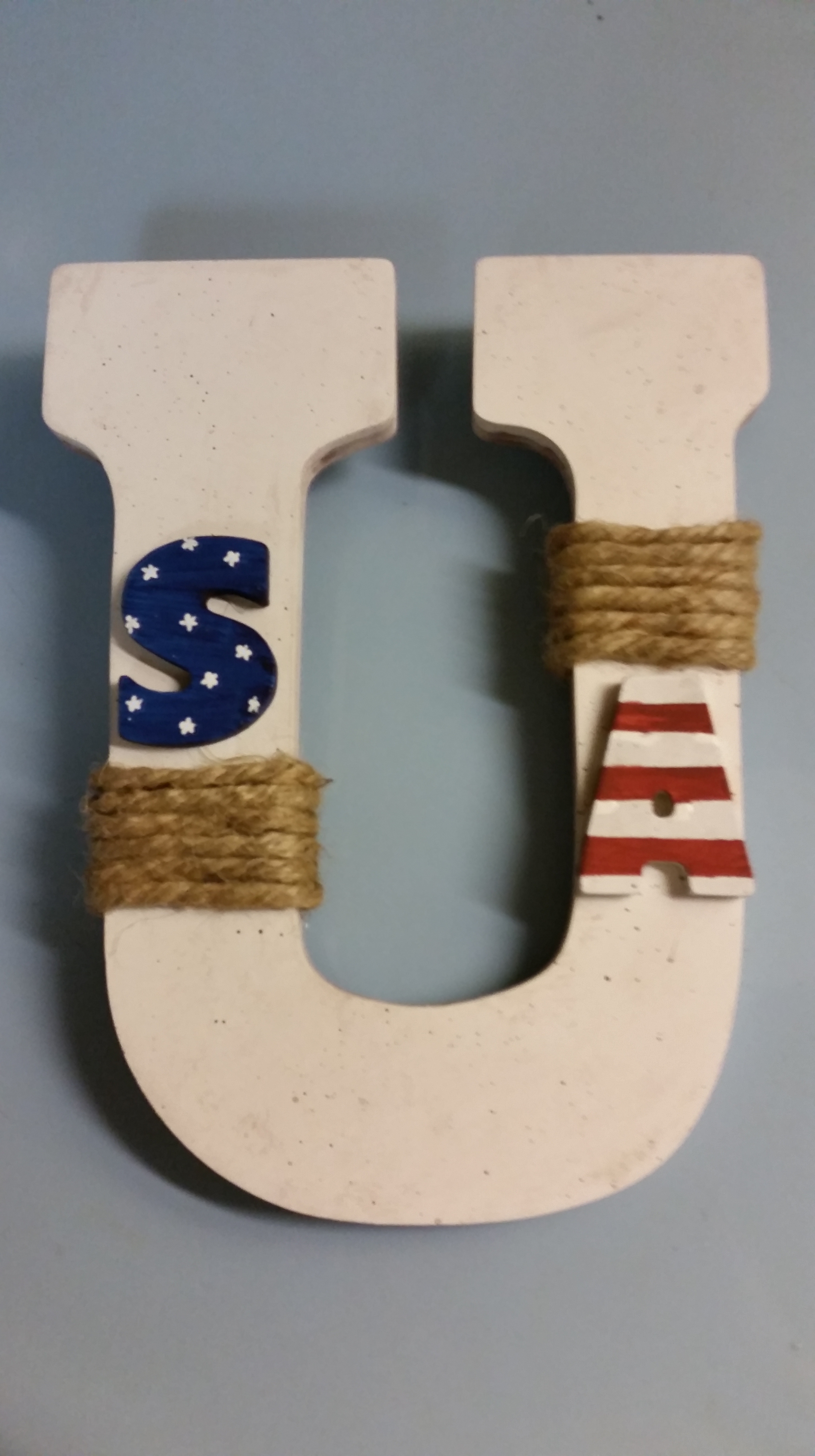 We bought plain letters from a craft store. I used acrylic paints to decorate the letters. I hot glued on the small letters and some jute string. Voila!