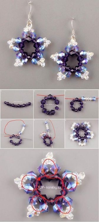 Following the picture; wire the dark blue beads alternating size. Add the star’s spokes, or petals, one at a time as in the middle photo. When all the spokes are attached, secure the wire and add your earring parts – lovely!