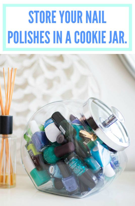Store Your Nail Polish in a Clear Glass Cookie Jar via Share this: Click to share on Facebook (Opens in new window) Facebook Click to share on X (Opens in new window) X Click to print (Opens in new window) Print Click to share on Tumblr (Opens in new window) Tumblr Click to email a link to a friend (Opens in new window) Email Like Loading... Related Around the houseBeauty & HairOrganize it
