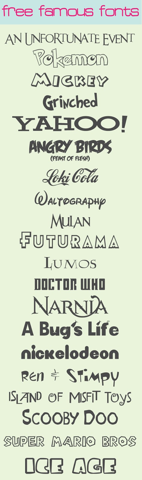 Free Famous Fonts Click HERE for the article and links Share this: Share on Facebook (Opens in new window) Facebook Share on X (Opens in new window) X Print (Opens in new window) Print Share on Tumblr (Opens in new window) Tumblr Email a link to a friend (Opens in new window) Email Like Loading... Related $ave itArtCommunicate itCraftsFunKidsReference