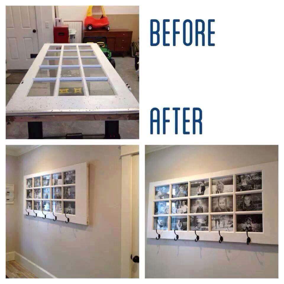 FB_IMG_1420645053765Print out pictures and secure them to the back of a glass panel door. Add some hooks and hang on a wall – So cute!