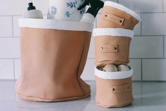 Materials: Leather, Rope, Sewing Machine (with zigzag setting), Leather Needle, Bowl, Metal Stamps, Hole Punch