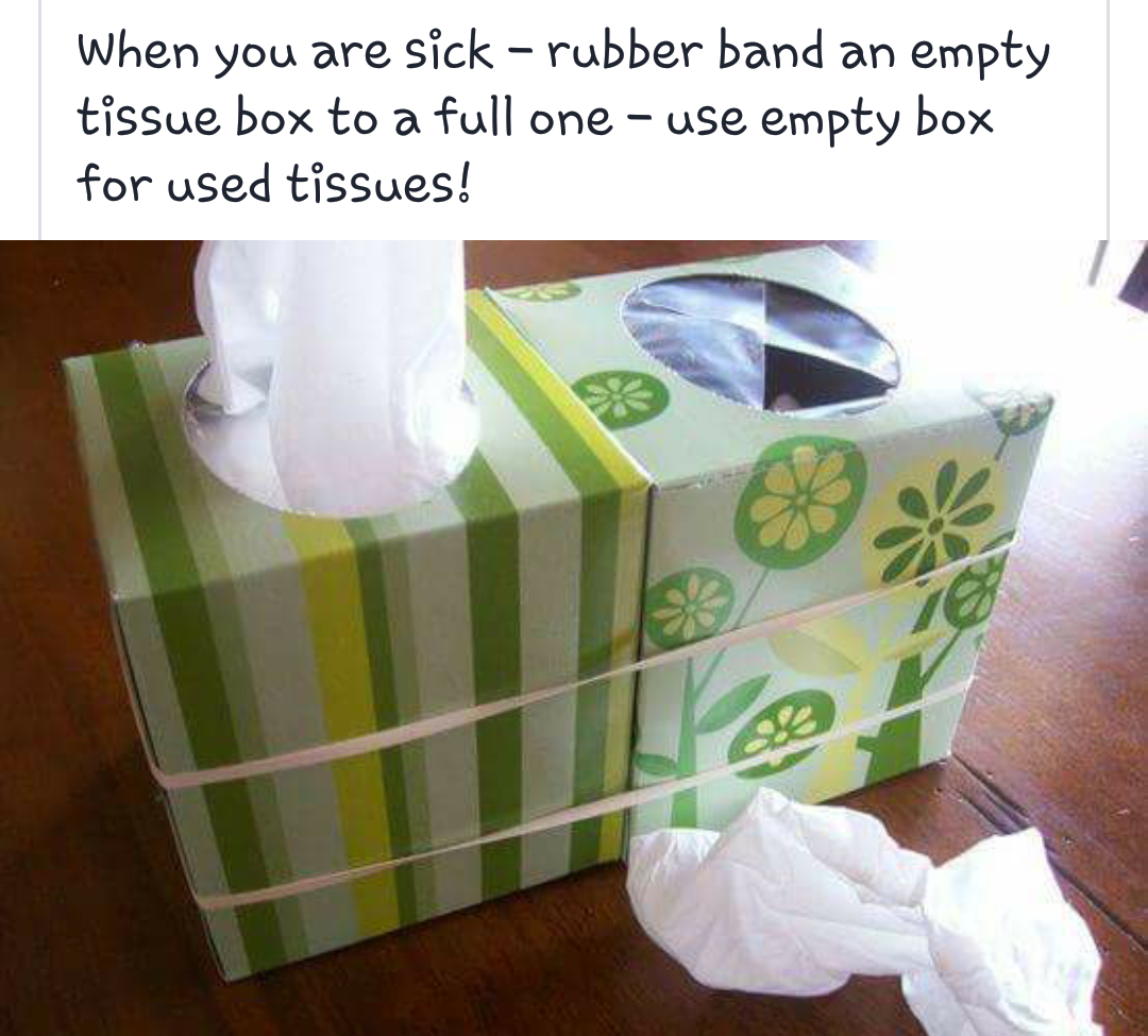 Kleenex Tip No more ‘snot rags’ thrown about when you use this trick! Thanks Andrea Share this: Click to share on Facebook (Opens in new window) Facebook Click to share on X (Opens in new window) X Click to print (Opens in new window) Print Click to share on Tumblr (Opens in new window) Tumblr Click to email a link to a friend (Opens in new window) Email Like Loading... Related Around the houseDid You Know?HealthKidsLeisurePaperRecycle it