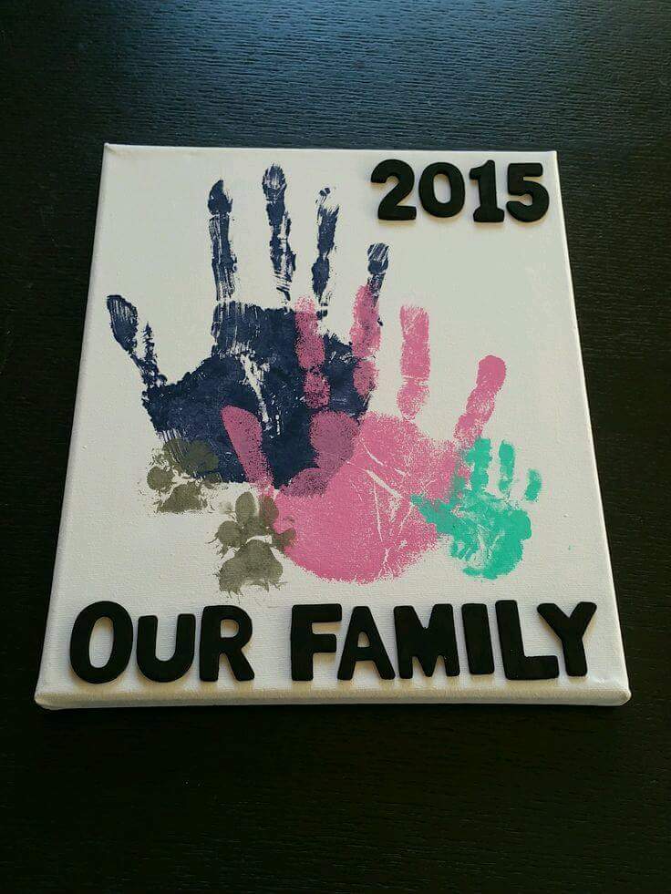 Use paints, starting with the largest hand and slightly overlapping each additional print. This family did theirs on a ceramic tile, but you could use paper, or fabric, or whatever you’d like. Don’t forget your pet’s paw prints too π