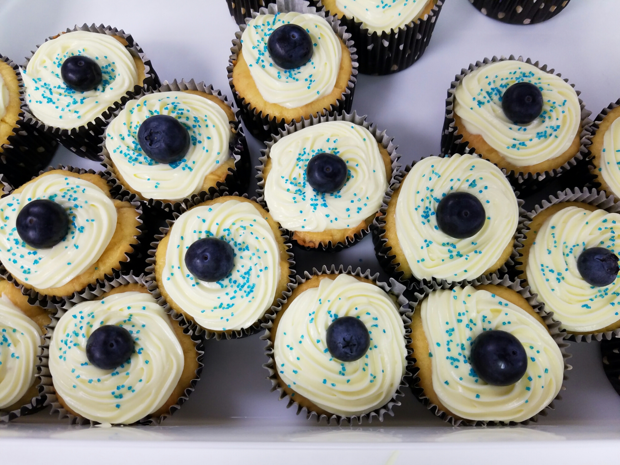 Mix together and bake in 350°f preheated oven in cupcake liners for 20 minutes. When cool, top with lemon frosting, blue sprinkles and a fresh blueberry!