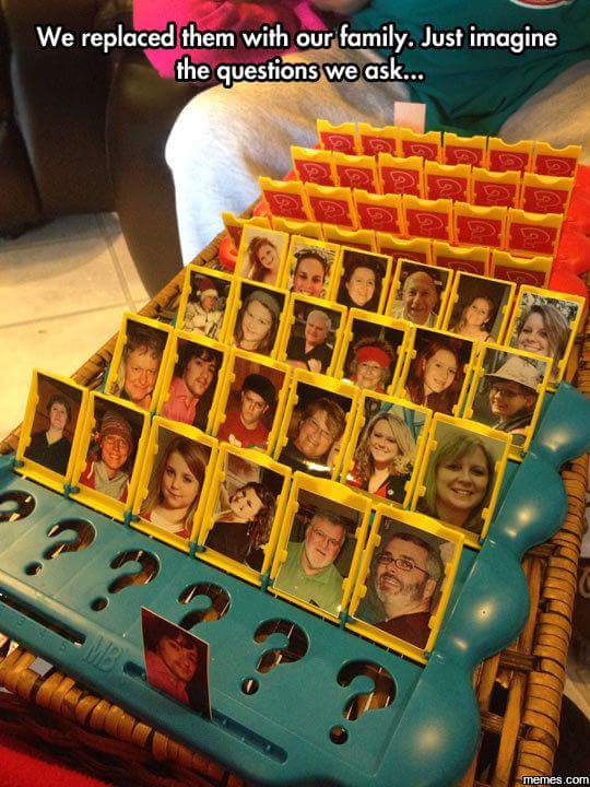 Family Guess Who Game Replace the photos on a Guess Who game with family members. Family fun! Pic via tumblr Share this: Share on Facebook (Opens in new window) Facebook Share on X (Opens in new window) X Print (Opens in new window) Print Share on Tumblr (Opens in new window) Tumblr Email a link to a friend (Opens in new window) Email Like Loading... Related Communicate itFamilyFunGamesKidsPlay Time