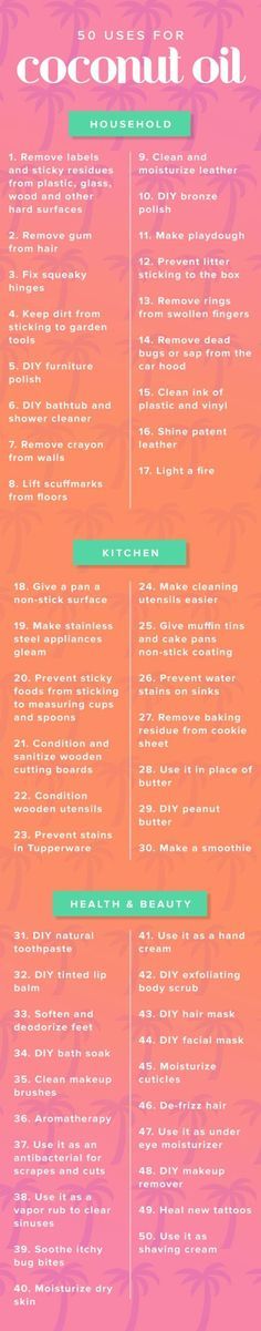 50 Uses for Coconut Oil We always hear how great coconut oil is – here’s a handy list so you are getting the most out of it! via Share this: Click to share on Facebook (Opens in new window) Facebook Click to share on X (Opens in new window) X Click to print (Opens in new window) Print Click to share on Tumblr (Opens in new window) Tumblr Click to email a link to a friend (Opens in new window) Email Like Loading... Related Around the houseBeauty & HairKitchenReference