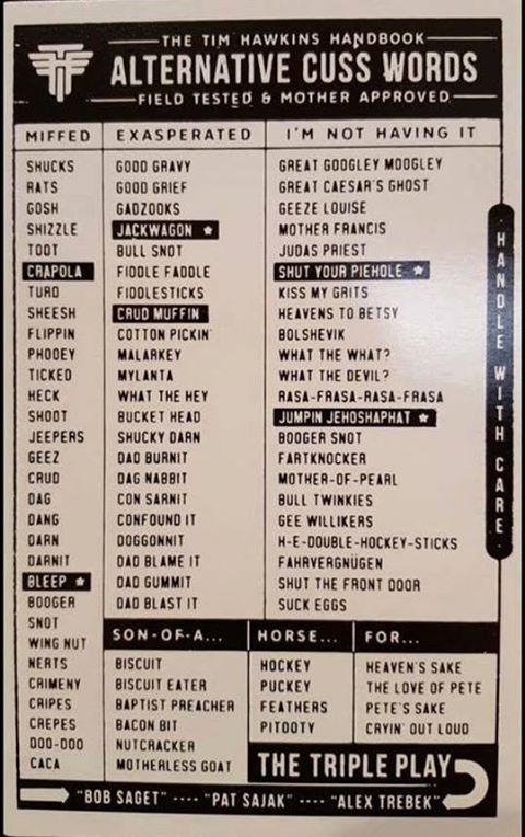 Alternative Cuss Words When you just can’t say the real thing! Via pinterest Share this: Share on Facebook (Opens in new window) Facebook Share on X (Opens in new window) X Print (Opens in new window) Print Share on Tumblr (Opens in new window) Tumblr Email a link to a friend (Opens in new window) Email Like Loading... Related Communicate itFunReference