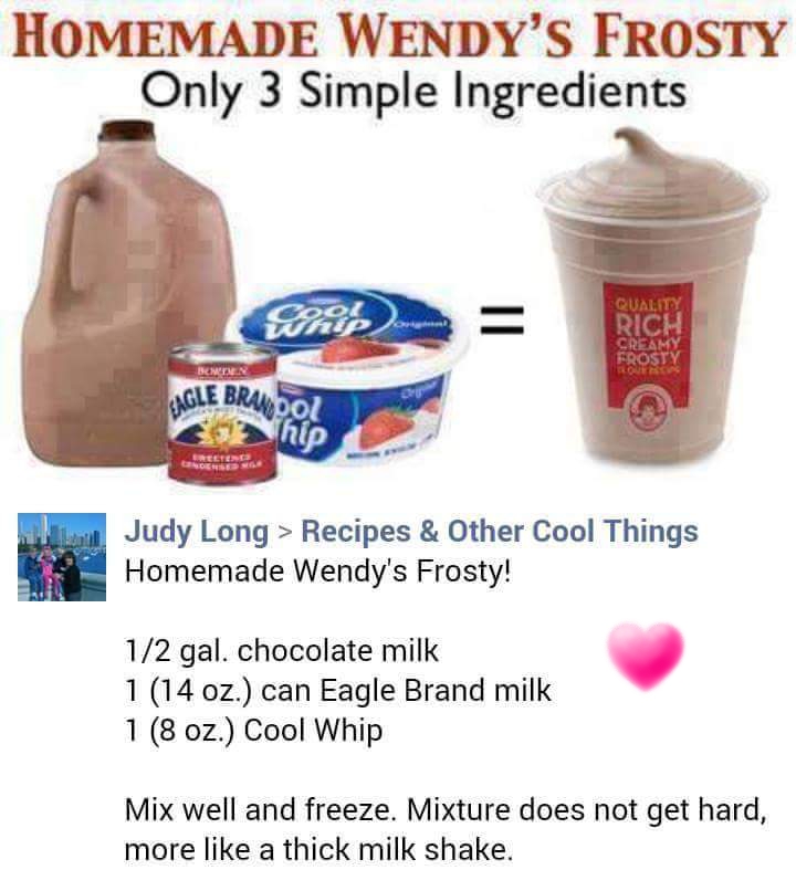 DIY Wendy’s Frosty Make your own at home: delish!!! Via fb Share this: Click to share on Facebook (Opens in new window) Facebook Click to share on X (Opens in new window) X Click to print (Opens in new window) Print Click to share on Tumblr (Opens in new window) Tumblr Click to email a link to a friend (Opens in new window) Email Like Loading... Related Dessert - Yum!KidsKitchenParty FoodsSnack it!