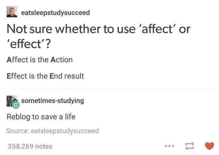 Affect vs. Effect Thanks Tamara Share this: Click to share on Facebook (Opens in new window) Facebook Click to share on X (Opens in new window) X Click to print (Opens in new window) Print Click to share on Tumblr (Opens in new window) Tumblr Click to email a link to a friend (Opens in new window) Email Like Loading... Related Did You Know?Education