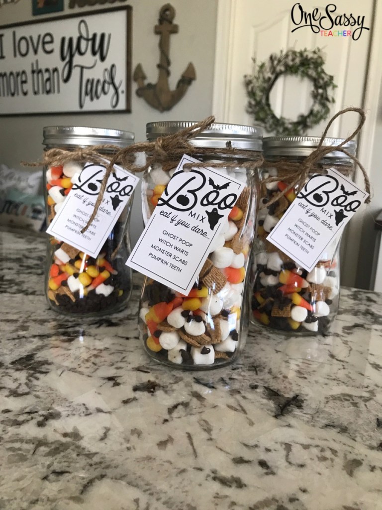Mini chips, marshmallows, square cereal, and candy corn are the ingredients; then make your own tags like the ones shown with the scary names – CUTE!