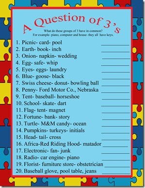 Quiz; Three things Print these out for your players – set a timer, or just see who can get them all correct! Answers HERE Share this: Click to share on Facebook (Opens in new window) Facebook Click to share on X (Opens in new window) X Click to print (Opens in new window) Print Click to share on Tumblr (Opens in new window) Tumblr Click to email a link to a friend (Opens in new window) Email Like Loading... Related Uncategorized