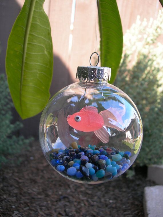 Nothing fishy about this ornament! This would be a nice way to commemorate a new pet in the family.. or a camping trip… or a beach trip – use shells and sand instead of aquarium rocks. Make it your own.