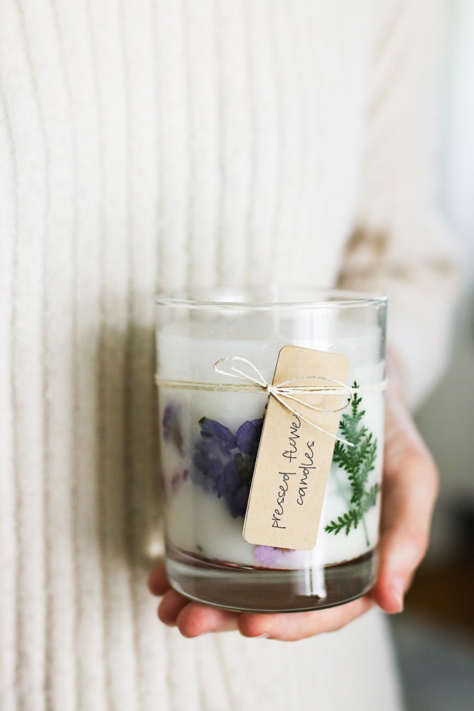 The trick is to first make a candle using your preferred wax in a slightly smaller container and let it cool. Then pop the candle out and place it inside the larger, final container. Then sandwich the flowers in between the candle and the glass, and pour a second layer of wax that will dry clear.