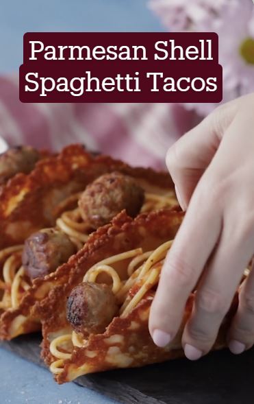Parmesan Shell Spaghetti Tacos This is genius! Check it out!! •2 cups shredded Parmesan cheese •1/2 pound spaghetti, cooked •16 mini meatballs, cooked •1/2 jar marinara sauce Click HERE for the pics step by step