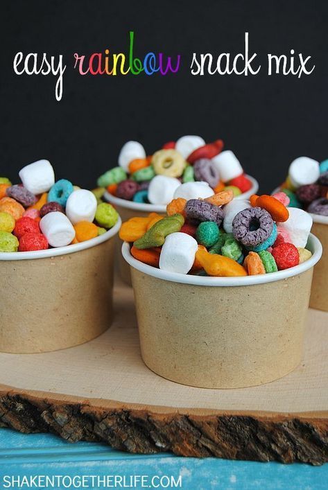 Easy Rainbow Snack Mix Got rainbow PRIDE?! Trix cerealFroot Loops cerealColors Goldfish crackersMini marshmallows Click HERE for the instructions