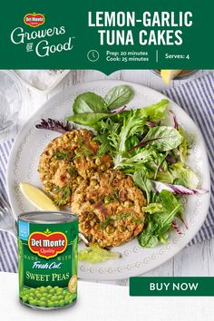 Lemon Garlic Tuna Cakes 1 Can Sweet Peas1/4 C panko crumbs1 Lemon1/2 cup plain 2% or nonfat Greek yogurt4 Tbsp. chopped fresh dill2 tsp. Dijon mustard1 tsp. minced garlic2 cans (5 oz. each) chunk tuna in water2 Tbsp. olive oil Click HERE for the instructions